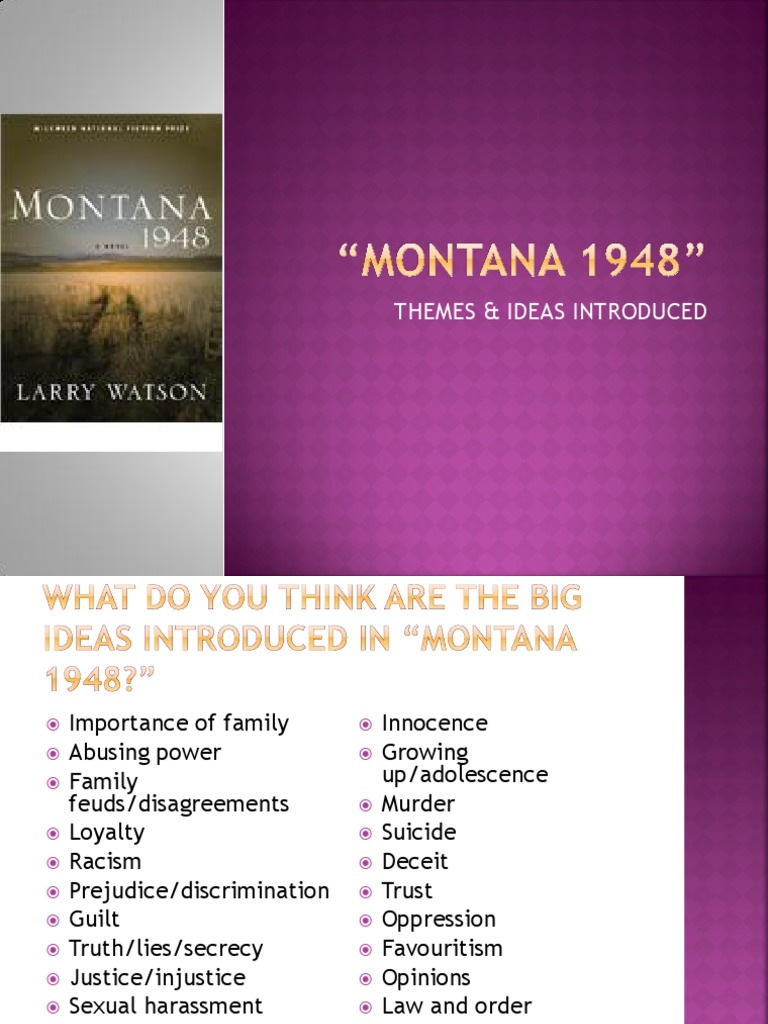 The harshness of the land and the flattening effect of wind and endless sky probably accounted for the relative tranquility of mercer county. And that disappointed me at the time. Larry watson in montana 1948 uses the motif of light and silence in many ways to reinforce ideas about truth and injustice. The central conflict in montana 1948 concerns the tensions and differences between the practice and enforcement of law and the more abstract notion of justice and the realization that the law does not or cannot always provide justice.